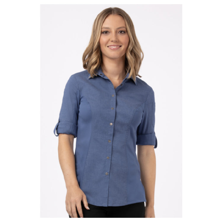 Chef Works SES02W-BLU-S Women's Seville Shirt Stretch Fabric Snap Front Closure