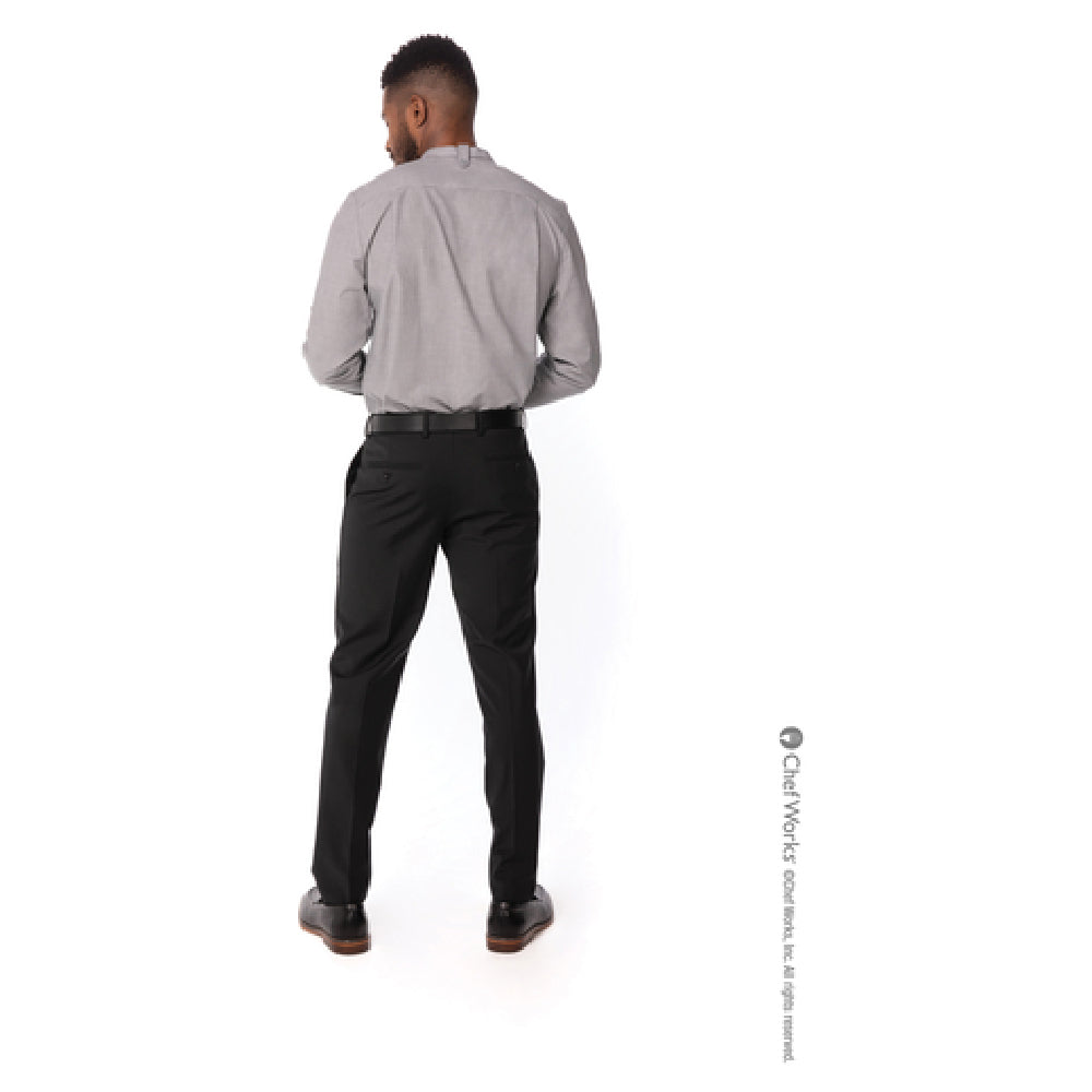 The Chef Works SFB02-BLK-M Men's Verismo Dress Shirt is meticulously designed for culinary professionals seeking style and functionality. Featuring roll-up long sleeves with button tab and adjustable cuffs, this shirt offers versatile adaptability for different working conditions. The banded collar includes a back of collar apron holder, providing added convenience for chefs in fast-paced environments. Its back yoke pleats ensure a comfortable fit, enhancing mobility and ease of movement. With a button front closure, this dress shirt exudes a classic look while maintaining practical utility. Made from a durable 62/38 cotton/poly blend, the fabric is lightweight yet resilient, making it suitable for long hours in the kitchen. The thin-stripe design in black adds a touch of sophistication, appealing to culinary professionals who value both form and function. Available in medium size, the Chef Works Verismo Dress Shirt is a perfect choice for chefs, waitstaff, and hospitality professionals who require a polished appearance with practical features. Its thoughtful design elements cater to the specific needs of the food service industry, emphasizing both style and comfort.