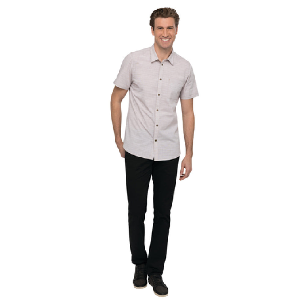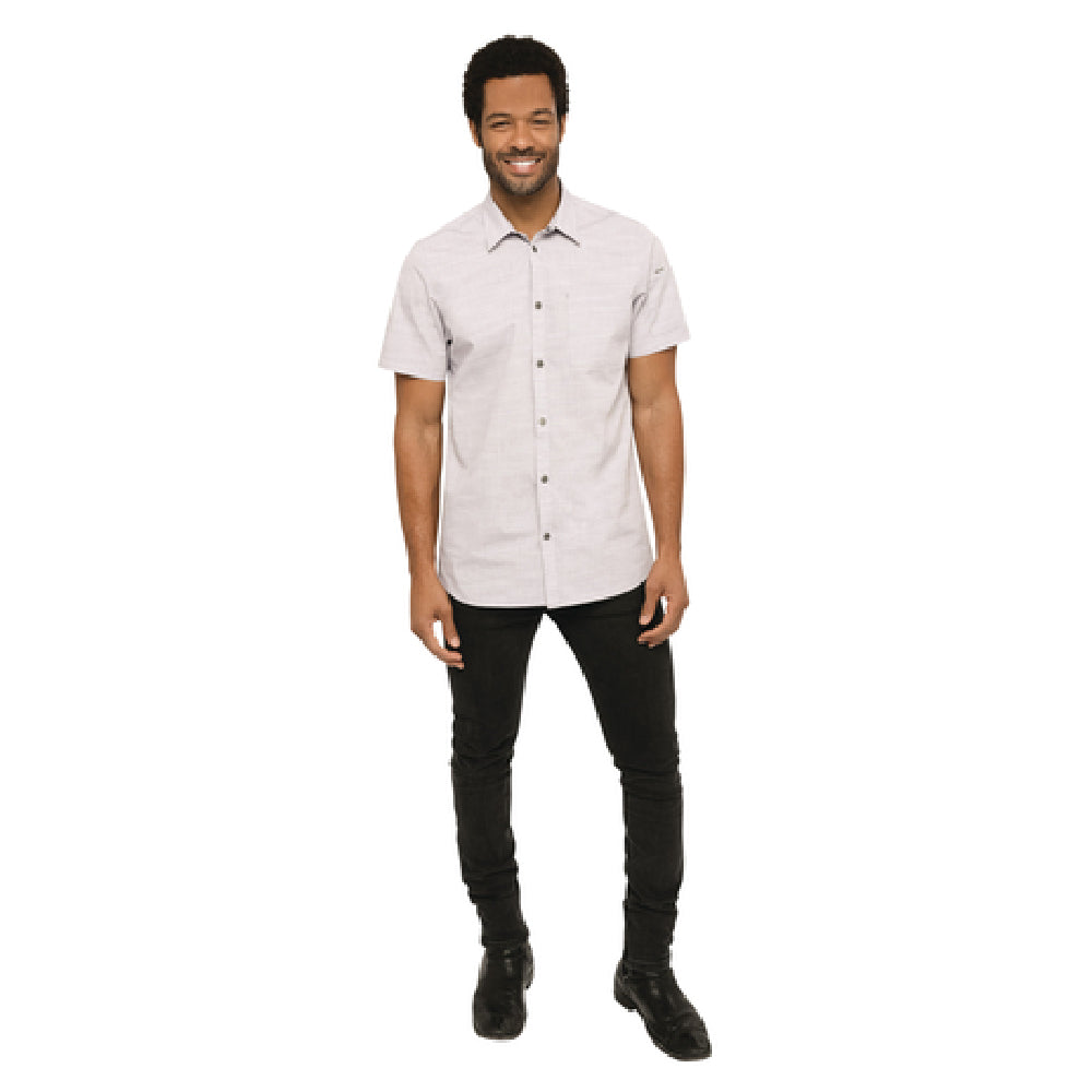 The Chef Works SHC01-TAU-M Havana Shirt is a sophisticated garment designed for both functionality and style in professional culinary environments. This short-sleeved shirt features a modern fit, catering to the contemporary needs of chefs and kitchen staff who prioritize both comfort and appearance. Made from a durable 65-35 poly-cotton blend, this shirt ensures breathability and ease of movement, essential in fast-paced kitchen settings. The shirt comes in a versatile taupe color, providing a neutral yet elegant look. Its snap front closure allows for quick and convenient wear, while the left sleeve pocket and left chest patch pocket add practical storage solutions for small essential items. Additionally, the back collar apron holder with a snap button is a thoughtful feature for chefs who frequently use aprons. The back yoke with pleats enhances the fit and flexibility, making it suitable for long hours of wear. The side hem detail not only adds a touch of style but also contributes to the shirt’s comfortable fit. Designed to meet the diverse demands of the culinary industry, the Chef Works SHC01-TAU-M Havana Shirt is an excellent choice for those seeking a balance between utility and modern fashion in a professional setting.