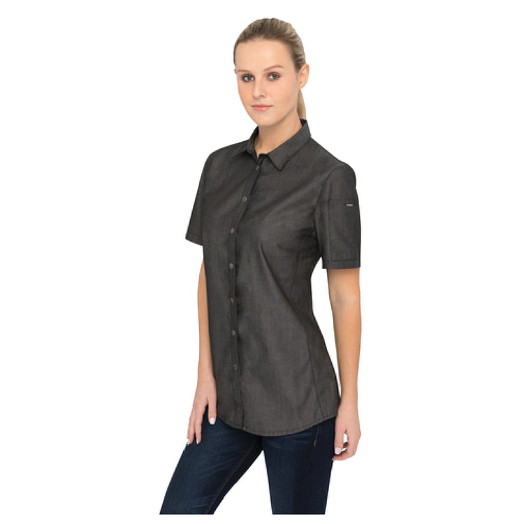 The Chef Works SHC03W-BLK-L Women's Detroit Shirt Short Sleeves Snap Front Closure is a modernly designed garment tailored for professionals in the culinary industry. This shirt features short sleeves and a snap front closure, providing ease of wear and practicality in fast-paced environments. It includes a left sleeve thermometer pocket, adding convenience for chefs who require quick access to essential tools. The shirt's front and back darts contribute to a modern fit, ensuring a sleek and stylish appearance that complements the professional setting. A back collar apron holder with a snap tab offers added functionality, allowing users to secure their apron effortlessly. The back yoke design enhances the shirt's comfort and fit, making it suitable for long hours in the kitchen. Constructed from a 63/37 cotton/poly denim blend in a classic black color, this shirt strikes a balance between durability and comfort. Available in size L, the Women's Detroit Shirt is an ideal choice for chefs seeking a blend of practicality and modern style in their workwear. Its combination of thoughtful design elements and high-quality materials positions it as a valuable asset for culinary professionals aiming for efficiency and style in the workplace.
