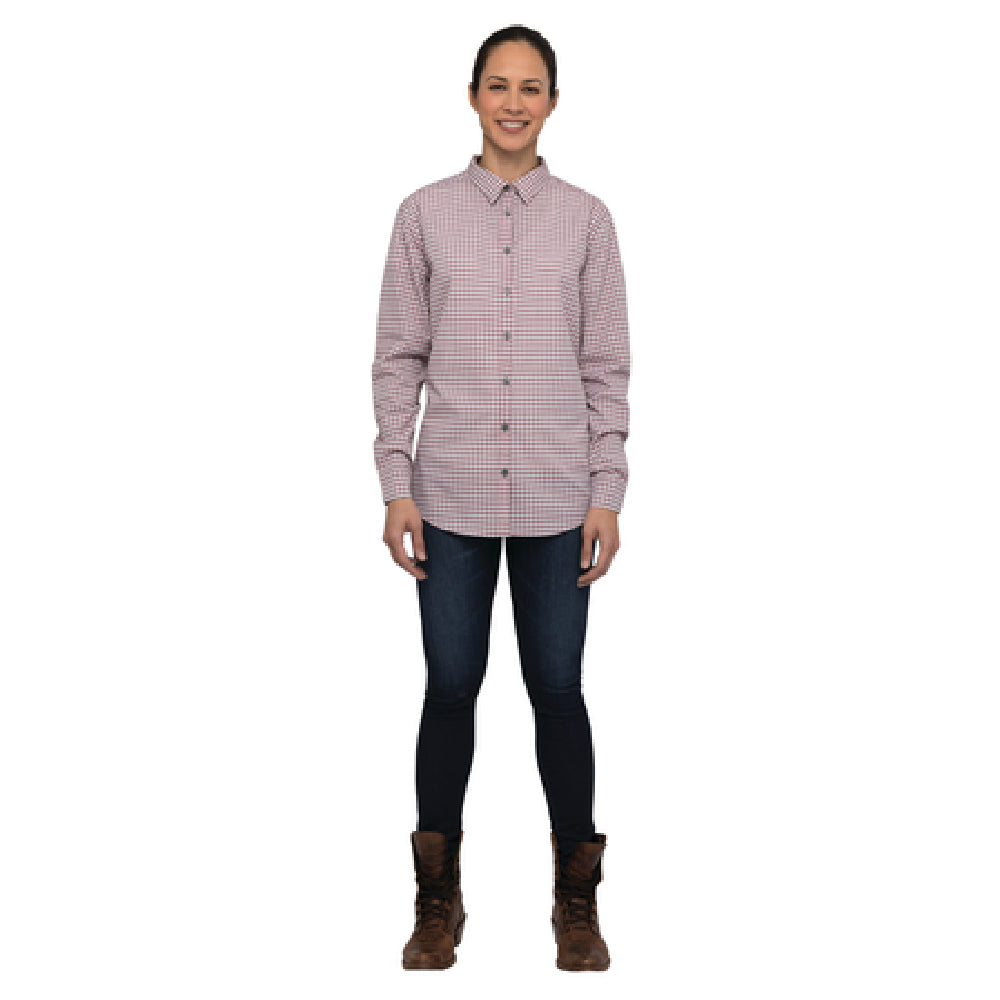The Chef Works SHC05W-CHP-2XL Women's Gingham Shirt Long Sleeves Contrast Fabric On Inner Sleeve Band is a meticulously designed garment tailored to combine style and practicality for culinary professionals. This shirt features long sleeves and a classic fit that ensures comfort and a polished appearance in any kitchen environment. Crafted from a 65/35 yarn-dyed poly/cotton blend, it provides durability and breathability, making it suitable for long shifts. The chili pepper color adds a vibrant touch, while the contrast fabric on the inner sleeve band offers a subtle, stylish detail. Functional elements include a button front, 2-button cuffs, and a top right placket that enhance its traditional aesthetic. The inner collar band and back yoke with an inverted pleat contribute to a refined silhouette and ease of movement. Available in a 2XL size, this shirt caters to those seeking a blend of elegance and functionality in a professional kitchen setting. Its thoughtful design makes it a practical choice for chefs and culinary staff, ensuring they remain comfortable and presentable throughout their workday.