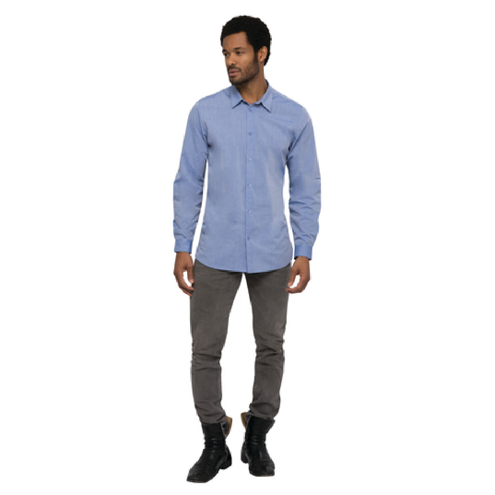 The Chef Works SHC06-BLU-L Men's Chambray Dress Shirt is a versatile garment designed for style and functionality in a professional setting. This shirt features roll-up long sleeves equipped with a button tab, allowing for adjustable sleeve lengths to suit the wearer's needs. The design includes a 2-button cuff for a secure fit and a side hem detail that enhances the modern look. The back yoke with pleats provides additional comfort and ease of movement, essential for busy work environments. A tonal button front closure underscores the shirt's sleek appearance. Made from a blend of 65% polyester and 35% cotton, this shirt offers a balanced combination of durability and comfort. The modern fit ensures a flattering silhouette, making it suitable for various professional segments, from culinary experts to hospitality staff. In a classic blue hue, the Chef Works SHC06-BLU-L shirt is both practical and stylish, meeting the demands of those who require a dependable yet fashionable workwear option. Available in size L, it caters to a broad audience seeking quality and contemporary design in their professional attire.
