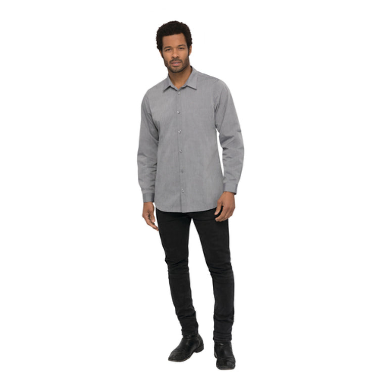 Chef Works SHC06-GRY-L Men's Chambray Dress Shirt Roll-up Long Sleeves With Button Tab