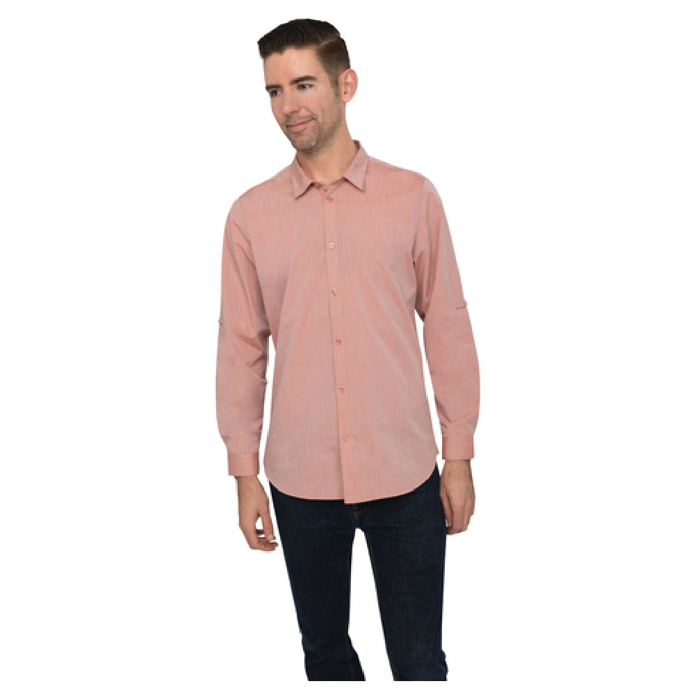 The Chef Works SHC06CINS Men's Chambray Dress Shirt is a stylish and functional addition to any professional wardrobe, designed with versatility and modern aesthetics in mind. This shirt features roll-up long sleeves with button tabs, allowing for a customizable look and added comfort during varied activities. The 2-button cuff provides a classic touch while ensuring a secure fit. Attention to detail is evident in the side hem detailing and the back yoke with pleats, which enhance the shirt's fit and mobility. The tonal button front closure offers a seamless and sleek appearance, aligning with its modern fit. Crafted from a durable 65/35 poly-cotton blend, this shirt combines the breathability of cotton with the resilience of polyester, ensuring long-lasting wear. The shirt's cinnamon color adds a unique flair, making it suitable for diverse environments ranging from culinary settings to casual business affairs. Available in size S, it caters to a segment of professionals looking for both functionality and style. The Chef Works SHC06CINS Chambray Dress Shirt stands out for its balance of comfort, practicality, and modern design, making it a valuable asset for individuals in the culinary field and beyond.