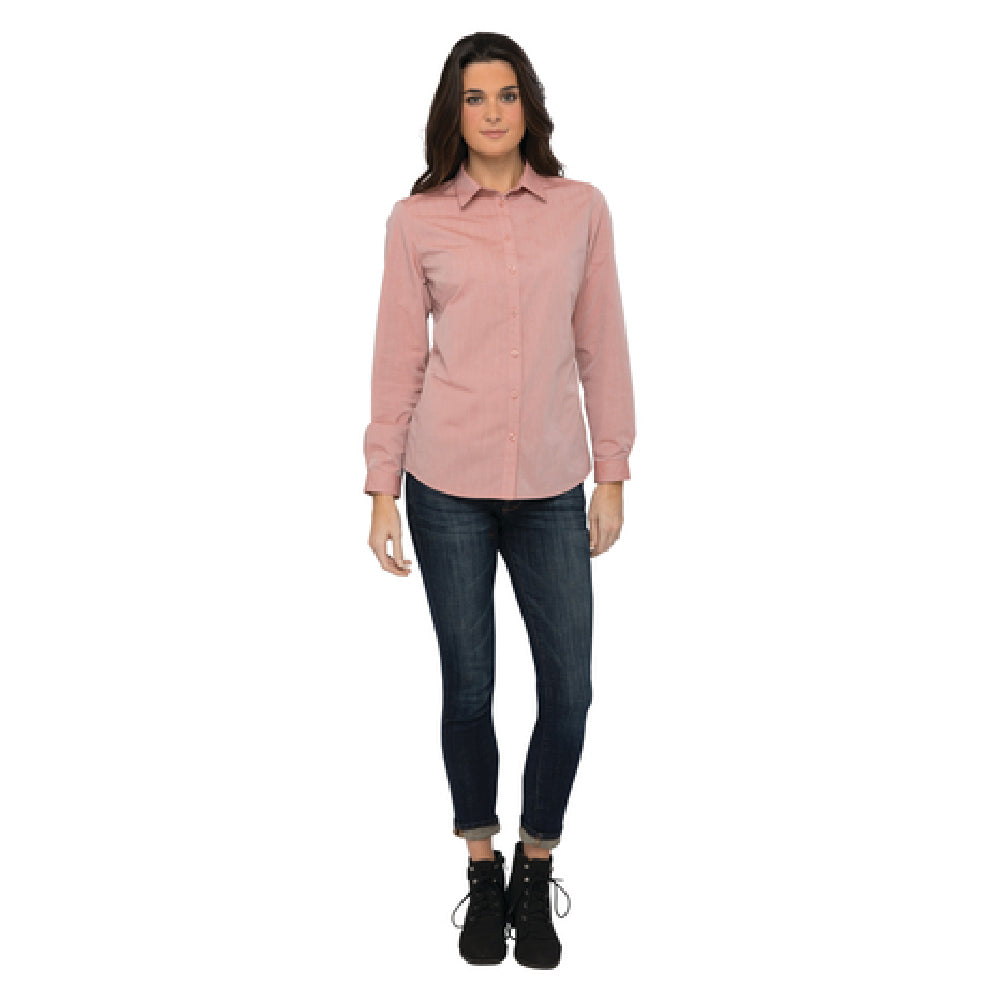 The Chef Works SHC06WCINL Women's Chambray Dress Shirt stands out as a modern piece crafted for both style and practicality in professional culinary settings. This shirt features roll-up long sleeves equipped with a button tab for versatile wearability, catering to the dynamic needs of hospitality professionals. The 2-button cuff design adds a touch of sophistication while ensuring a secure fit. Designed with a side hem detail and a back yoke, the shirt offers a flattering and comfortable modern fit that enhances mobility. Its tonal button front closure complements the shirt's sleek aesthetic, making it a suitable choice for both front and back-of-house roles. Constructed from a 65/35 poly-cotton blend, the shirt boasts an anti-wrinkle finish, ensuring a polished appearance with minimal upkeep, ideal for fast-paced work environments. The cinnamon color adds a unique twist to traditional uniform options, allowing for a subtle expression of personal style. Available in size L, this dress shirt is precisely tailored to meet the demands of the culinary industry, providing both functionality and a professional look. The Chef Works SHC06WCINL Women's Chambray Dress Shirt is an exemplary blend of comfort, style, and durability, making it an essential garment for hospitality professionals seeking reliability and elegance in their workwear.