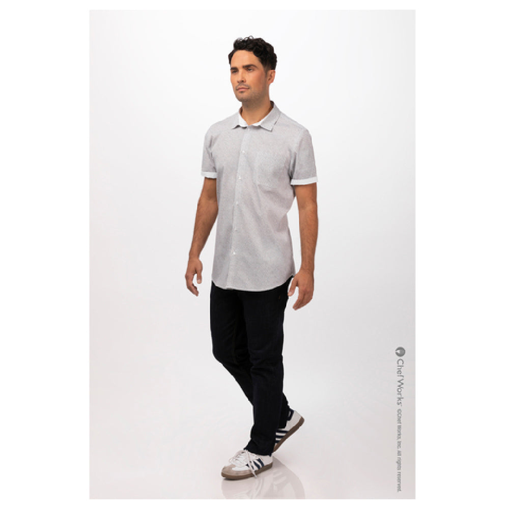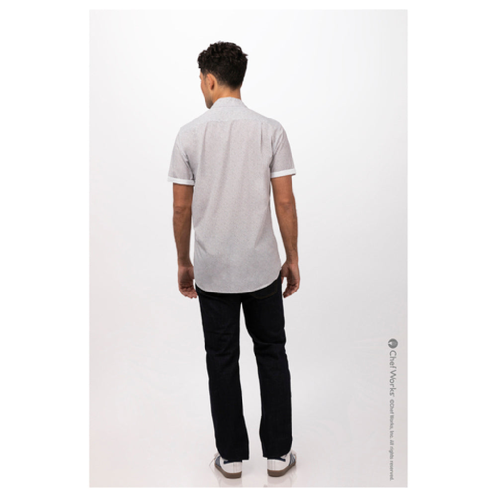 The Chef Works SHC07NATXL Men's Charleston Shirt is a versatile garment designed for culinary professionals seeking both functionality and style. This short-sleeved shirt is crafted from a durable 65/35 poly-cotton blend, ensuring a comfortable fit that withstands the rigors of a bustling kitchen. The shirt features a unique "ditsy print" in a natural color, complementing its sophisticated design. A standout element is the contrast fabric detailing on the inner sleeve band and inner collar band, adding a touch of elegance and distinction. The matching button front provides a seamless look, while the left sleeve pocket offers convenient storage for small essentials. The back yoke with pleats is engineered for improved fit and mobility, catering to the dynamic movements required in culinary environments. Available in XL size, this shirt is ideal for chefs and kitchen staff who prioritize a blend of practicality and aesthetic appeal. The Chef Works SHC07NATXL Men's Charleston Shirt is tailored to meet the diverse needs of the culinary industry, making it a valuable addition to any professional kitchen wardrobe.