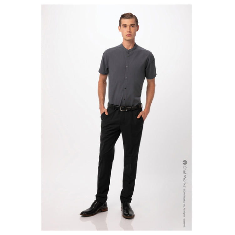 Chef Works SHC08-CHR-M Men's Seersucker Shirt brings a blend of style and functionality to professional culinary apparel. This short-sleeved shirt features a snap front closure, making it quick and easy to wear while ensuring a secure fit. The banded collar includes a back collar apron holder snap tab, offering convenient apron management during busy kitchen shifts. Crafted from a 65/35 poly-cotton blend, this shirt provides durability and comfort, ideal for long hours in a high-paced environment. The charcoal hue adds a sophisticated touch to the kitchen wardrobe, appealing to chefs and kitchen staff alike. Designed with practicality in mind, the shirt includes a left sleeve inset pocket, perfect for holding pens or small kitchen tools. The back yoke with darts and side seam slits ensure a comfortable fit and ease of movement, making it suitable for diverse kitchen tasks. Available in medium size, the Chef Works Seersucker Shirt is tailored to meet the needs of culinary professionals, providing them with a reliable and stylish piece of workwear. This shirt stands out for its thoughtful design, blending professional aesthetics with essential functional features that cater to the demands of the culinary industry.