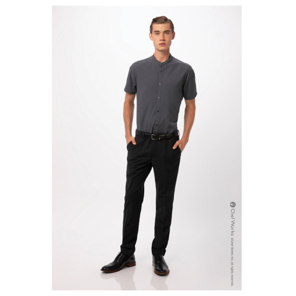The Chef Works SHC08CHRM Men's Seersucker Shirt - short sleeves, snap front closure - is a versatile garment designed for culinary professionals seeking comfort and style. Crafted from a 65/35 poly-cotton blend, this shirt offers a breathable and durable fabric suitable for the fast-paced environment of a kitchen. The banded collar with a back collar apron holder snap tab ensures that aprons remain securely in place, enhancing functionality and convenience. The left sleeve inset pocket provides an additional utility space, ideal for storing small kitchen tools or pens. The back yoke with darts enhances the fit and mobility, allowing for ease of movement, while the side seam slits contribute to a relaxed and comfortable silhouette. Available in a charcoal medium size, this shirt is both practical and stylish, making it a valuable addition to any chef's wardrobe. Its unique features cater to the needs of professionals across various culinary segments, from high-end restaurants to catering services, emphasizing both performance and aesthetic appeal. The Chef Works SHC08CHRM shirt is a testament to functional design, tailored for the demands of the industry while maintaining a professional appearance.