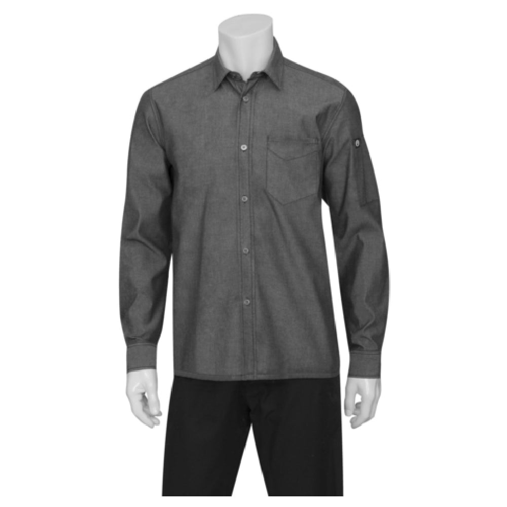 The Chef Works SKL001-BLK-S Men's Detroit Shirt is a versatile garment designed to meet the needs of professionals across various industries. This shirt features roll-up long sleeves with a convenient 1-button tab, allowing for easy adjustment and adaptability in dynamic work environments. With antique metal buttons, it adds a touch of classic style to its practical functionality. The left chest and left sleeve thermometer pockets provide specialized storage solutions for culinary professionals who require quick access to essential tools. Offering a classic fit, this shirt is crafted from 100% lightweight cotton denim, ensuring comfort and breathability throughout the workday. The enzyme wash treatment enhances the fabric's softness and durability, making it suitable for the demands of daily wear. Available in black and size small, the shirt's understated design complements various uniform requirements while its practical features address the specific needs of chefs and kitchen staff. The Chef Works Men's Detroit Shirt combines style, comfort, and utility, positioning it as a valuable addition to any professional wardrobe.
