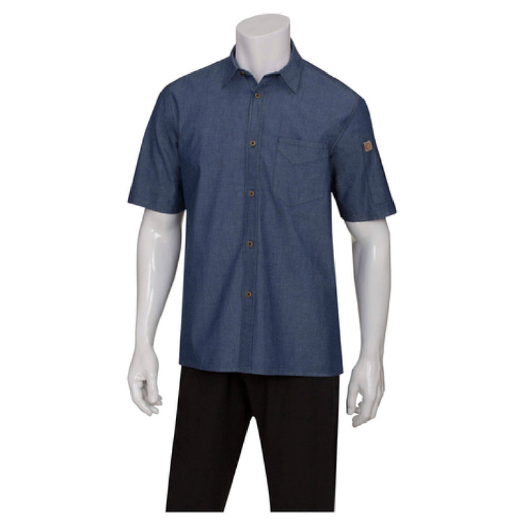 The Chef Works SKS002-IBL-S Men's Detroit Shirt is a versatile garment designed for the culinary professional seeking both style and functionality. This hybrid style shirt features short sleeves and is crafted from 100% lightweight cotton denim, providing breathable comfort suitable for long hours in the kitchen. Its indigo blue hue and enzyme wash lend a classic and polished appearance, while the antique metal buttons add a touch of vintage charm. The shirt is available in a classic fit, catering to those who prefer a traditional, roomy style. Practicality is at the forefront with strategically placed pockets: a left chest pocket for convenient storage and a left sleeve thermometer pocket for quick access to essential tools. The combination of design and utility makes the Chef Works SKS002-IBL-S Men's Detroit Shirt an ideal choice for chefs, line cooks, and kitchen staff who value both aesthetics and practicality. This shirt represents a harmonious blend of style and utility, meeting the needs of professionals in the hospitality industry while maintaining a sophisticated look that transitions effortlessly from the kitchen to the front-of-house. Its thoughtful construction is tailored to enhance the efficiency and style of culinary experts.