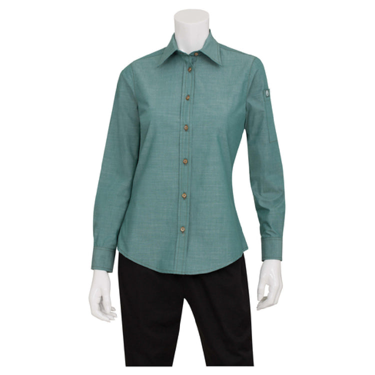 The Chef Works SLWCH002-GRM-M Women's Chambray Dress Shirt Roll-up Long Sleeves With Button Tab is a versatile garment designed for professionals seeking both style and functionality. This shirt features roll-up long sleeves with a button tab, allowing for adjustable sleeve length to suit various work environments. It includes a back yoke with a boxed pleat, enhancing mobility and providing a comfortable fit. The faux horn buttons add a classic touch to the design, while the left sleeve cell phone pocket offers practicality, ensuring essential items are always within reach. Crafted from a blend of 60% cotton and 40% polyester, this shirt boasts an anti-wrinkle finish, making it ideal for busy professionals who require a polished appearance with minimal maintenance. The medium size in green mist provides a classic fit that complements various body types. This garment is particularly well-suited for the hospitality industry, offering a blend of durability and style that meets the demands of the culinary environment. Its thoughtful design elements and high-quality material composition make the Chef Works SLWCH002-GRM-M an exceptional choice for women seeking reliable and elegant workwear.