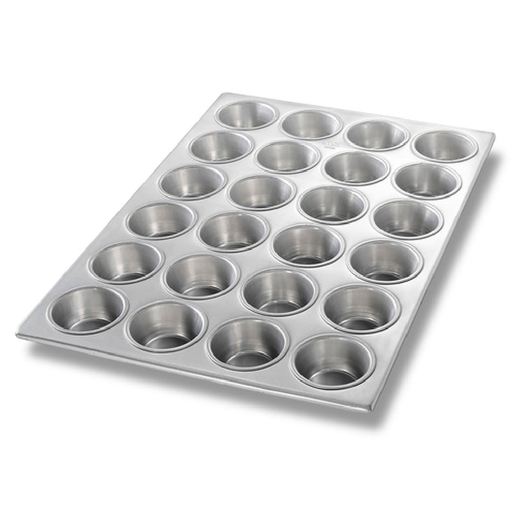 The Chicago Metallic 46520 Cupcake Pan is a specialty bakeware piece designed for high-capacity baking needs, measuring 14-1/8" x 20-3/4" overall and capable of producing 24 cupcakes with a diameter of 2-3/4" each. Each cavity holds a capacity of 3.8 oz, providing uniform baking results. Constructed from 20-gauge aluminum, this pan ensures durability and excellent heat conductivity, making it an ideal choice for both professional and home bakers seeking consistency and efficiency in their baking processes. Its wire-in-rim design adds structural integrity, helping to maintain its shape and stability even under heavy use. This cupcake pan is plain, reflecting its utilitarian design and is made in the USA using global materials, guaranteeing quality and adherence to manufacturing standards. Packed six per case, it is suitable for both commercial establishments like bakeries and cafes, as well as baking enthusiasts looking to elevate their baking capabilities. The Chicago Metallic 46520 Cupcake Pan stands out for its robust construction and high-volume baking capacity, making it a valuable addition to any kitchen environment where quality and reliability are paramount.