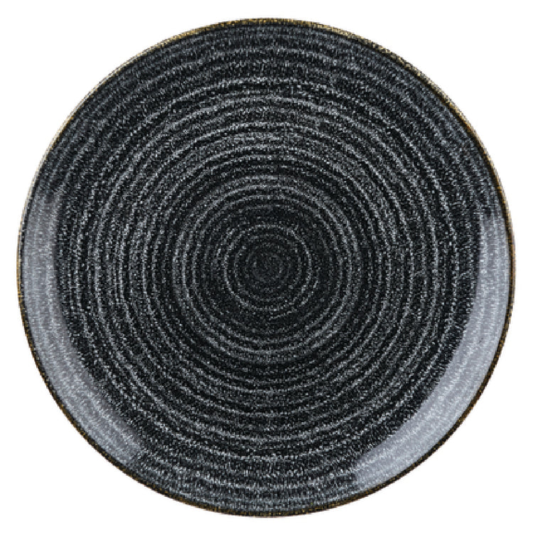 The Churchill China SPCBEV101 Plate 10-1/4" Dia. Round is a versatile dinnerware piece suitable for various dining environments, ranging from casual eateries to upscale restaurants. With a diameter of 10-1/4 inches, this round, coupe-style plate boasts a rolled edge design, which enhances its durability and aesthetic appeal. Its construction from Super Vit ceramic ensures excellent strength and resistance to chipping, making it a reliable choice for high-traffic settings. The plate is microwave and dishwasher safe, providing convenience in both preparation and cleanup stages. An eco-glazed finish not only contributes to its appealing charcoal black color but also underscores Churchill's commitment to environmentally friendly production methods. Part of the Studio Prints Homespun Evolve collection, this plate harmoniously blends traditional style with contemporary design elements. Its availability as a US-stocked item facilitates prompt delivery and better stock management for businesses. This product is ordered per case only, aligning with the needs of bulk purchasing typical in commercial settings. The Churchill China SPCBEV101 Plate offers a practical and stylish solution for establishments looking to enhance their table setting with durable, aesthetically pleasing, and sustainably crafted dinnerware.