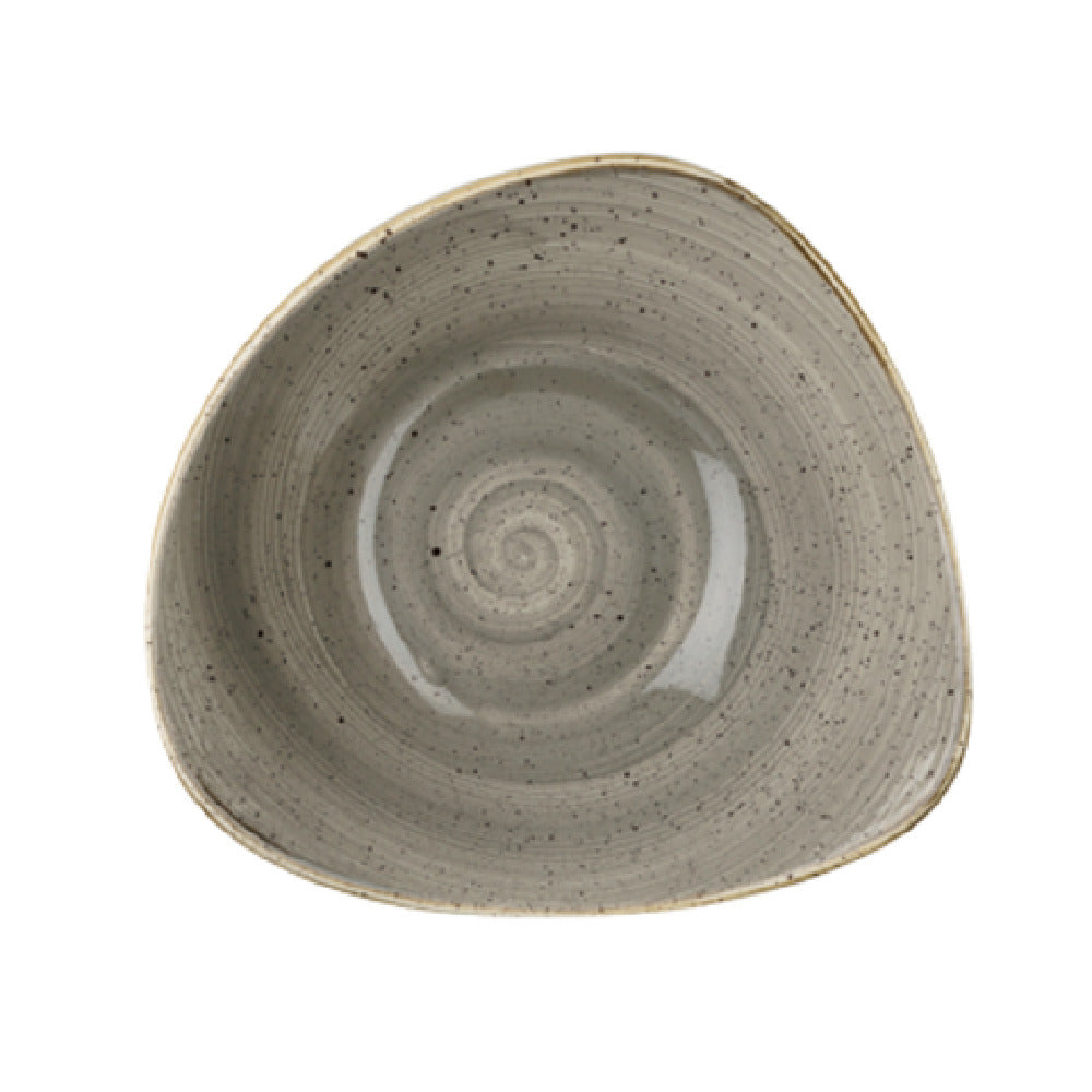 The Churchill China SPGSTRB91 Bowl - 21 oz. - 9-1/4" is a distinctive and versatile addition to any dining collection, especially tailored for hospitality and culinary professionals. This triangular bowl, crafted from durable ceramic, features a rolled edge that enhances both its resilience and aesthetic appeal. Its 21-ounce capacity makes it suitable for a variety of dishes, from soups to desserts, accommodating diverse menu offerings with ease. The eco-glazed finish in Peppercorn Grey not only provides an elegant visual appeal but also reflects a commitment to sustainable practices. As part of the Churchill® Super Vit and Stonecast® collection, this bowl is designed to withstand the rigors of commercial use, being both microwave and dishwasher safe, thereby ensuring efficiency and longevity in busy kitchen environments. US stocked and available for order per case only, this bowl is a practical choice for large-scale dining establishments seeking reliable and stylish dinnerware solutions. The combination of its unique shape, robust construction, and eco-friendly glaze positions the Churchill China SPGSTRB91 Bowl as a valuable component in any restaurant, catering, or hospitality setting, meeting the demands of industry professionals through its thoughtful design and quality craftsmanship.