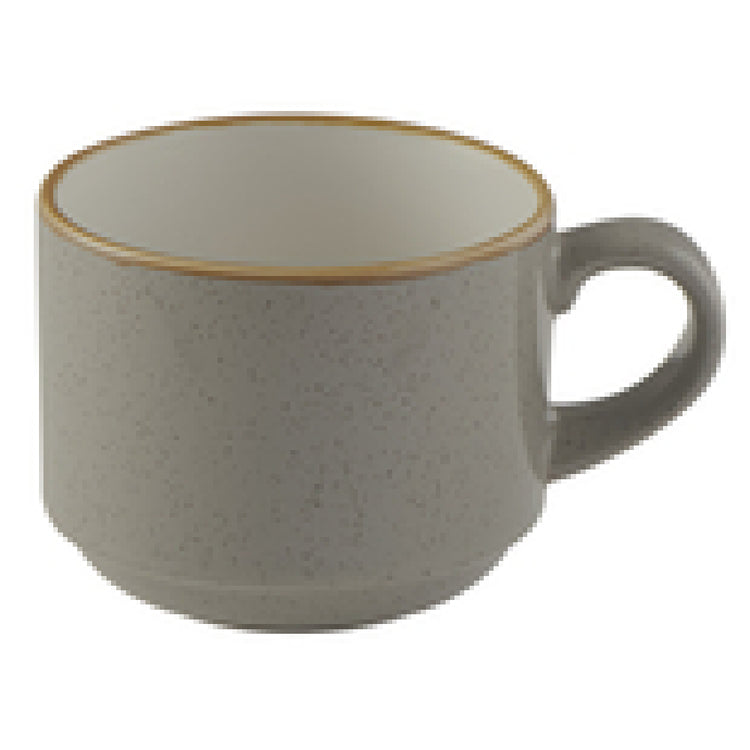 Churchill China SPGSVSC81 Cup 8 Oz. - a meticulously crafted ceramic cup designed to enhance both functionality and aesthetic appeal. With a capacity of 8 ounces, this cup features dimensions of 3-1/3 inches in diameter and 2-3/4 inches in height, making it an ideal choice for various beverage servings. The inclusion of a handle ensures ease of use, while its stackable design offers efficient space-saving solutions, particularly beneficial for hospitality and food service industries. The eco-glazed finish of the cup not only provides an elegant Peppercorn Grey hue but also ensures an environmentally-friendly production process. The Churchill® Super Vit and Stonecast® technologies employed in its manufacture accentuate its durability and resilience, making it microwave and dishwasher safe—attributes that cater to high-demand environments such as cafes and restaurants. As a US stocked item, it guarantees availability and quick delivery, with orders accepted per case only, thus supporting bulk purchasing for large-scale operations. This product's distinguished design and robust construction make it a versatile choice for diverse market segments, from upscale dining establishments to casual eateries, seeking reliable and aesthetically pleasing tableware solutions.