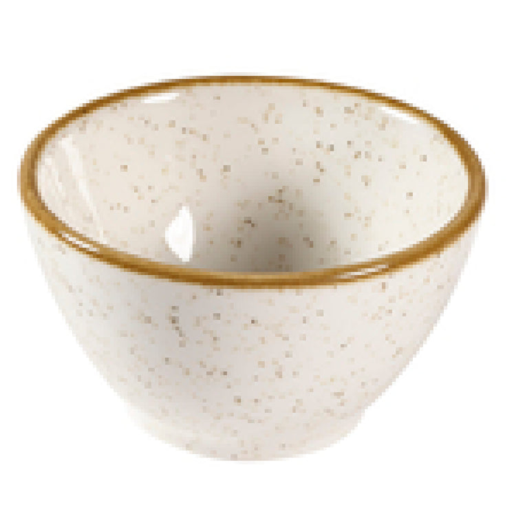 The Churchill China SWHSBSD41 Dip Pot 4 Oz. 3-3/8" Dia. is a versatile serving solution, ideal for the hospitality industry. This ceramic dip pot is crafted with a reactive color glaze, providing a unique and appealing aesthetic. Measuring 3-3/8 inches in diameter, it offers a 4-ounce capacity, perfect for serving sauces, dips, or condiments. The dip pot features Churchill® Super Vit technology, ensuring superior durability and resistance to mechanical and thermal shock. Part of the Stonecast® collection, it comes in a Barley White finish, adding a touch of elegance to any table setting. Notably, this product is microwave and dishwasher safe, making it a practical choice for busy food service environments. Each case contains 12 dip pots, and it is available as a UK stocked item, facilitating efficient procurement and replenishment for catering businesses. This dip pot seamlessly combines functionality with style, making it a favorable choice for restaurants, cafes, and catering services looking to enhance their tableware offerings with reliable and aesthetically pleasing pieces. Its robust construction and elegant design ensure it meets the demands of both high-end and casual dining experiences, positioning it as a valuable component of any professional kitchen or dining setup.