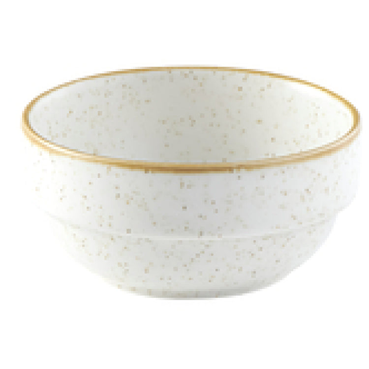 The Churchill China SWHSVB141 Bowl 12.6 Oz. 4-1/2" Dia. X 2-1/8"H is a versatile and practical choice for a variety of settings within the food service industry. This ceramic bowl features a capacity of 12.6 ounces, making it suitable for serving soups, salads, or appetizers. Its dimensions of 4-1/2 inches in diameter and 2-1/8 inches in height offer a compact yet functional size that is perfect for both commercial and home use. The bowl is designed with a round shape and a stackable construction, allowing for efficient storage and organization when not in use. The rolled edge not only adds to the bowl's durability but also enhances its aesthetic appeal. This product is microwave and dishwasher safe, ensuring ease of use and maintenance in busy kitchen environments. The eco glazed finish provides an additional layer of protection and contributes to its sustainable attributes. Part of the Churchill® Super Vit collection, this Stonecast® bowl in Barley White is a US stocked item, available in cases of six, catering to the needs of various market segments. Its blend of functionality, durability, and style makes it a valuable addition to any dining establishment or household.