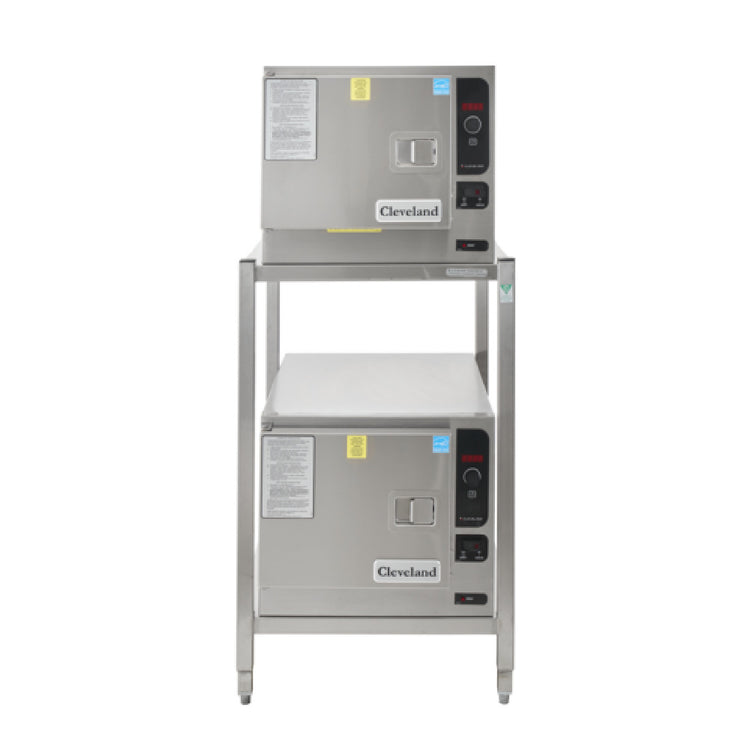 The Cleveland (2) 22CET33.1_208/60/1 SteamChef™ 3 Convection Steamers Electric Boilerless is a state-of-the-art appliance specifically designed for professional kitchens seeking efficiency and precision in steaming. This model features two 22CET3.1 units, expertly stacked on a UNISTAND25 equipment stand, complemented by the CHEFSTACKIT accessory. Each compartment accommodates up to three full-size pans, maximizing capacity for high-demand culinary environments. The units boast left-hand hinged doors with controls on the right, incorporating SureCook technology for consistent results. A 60-minute electro-mechanical timer with a load compensating feature ensures precise cooking times. The SteamChef™ automatic drain control and KleanShield™ interior are designed for easy maintenance and superior hygiene. Adjustable 4-inch legs provide stability and flexibility in placement. This model is UL and cUL certified, meeting stringent safety standards, and carries the ENERGY STAR® rating, highlighting its energy efficiency. Ideal for various sectors within the foodservice industry, from restaurants to catering businesses, the Cleveland SteamChef™ 3 Convection Steamers offer a reliable and state-of-the-art solution for steam cooking, emphasizing robust performance and operational savings.