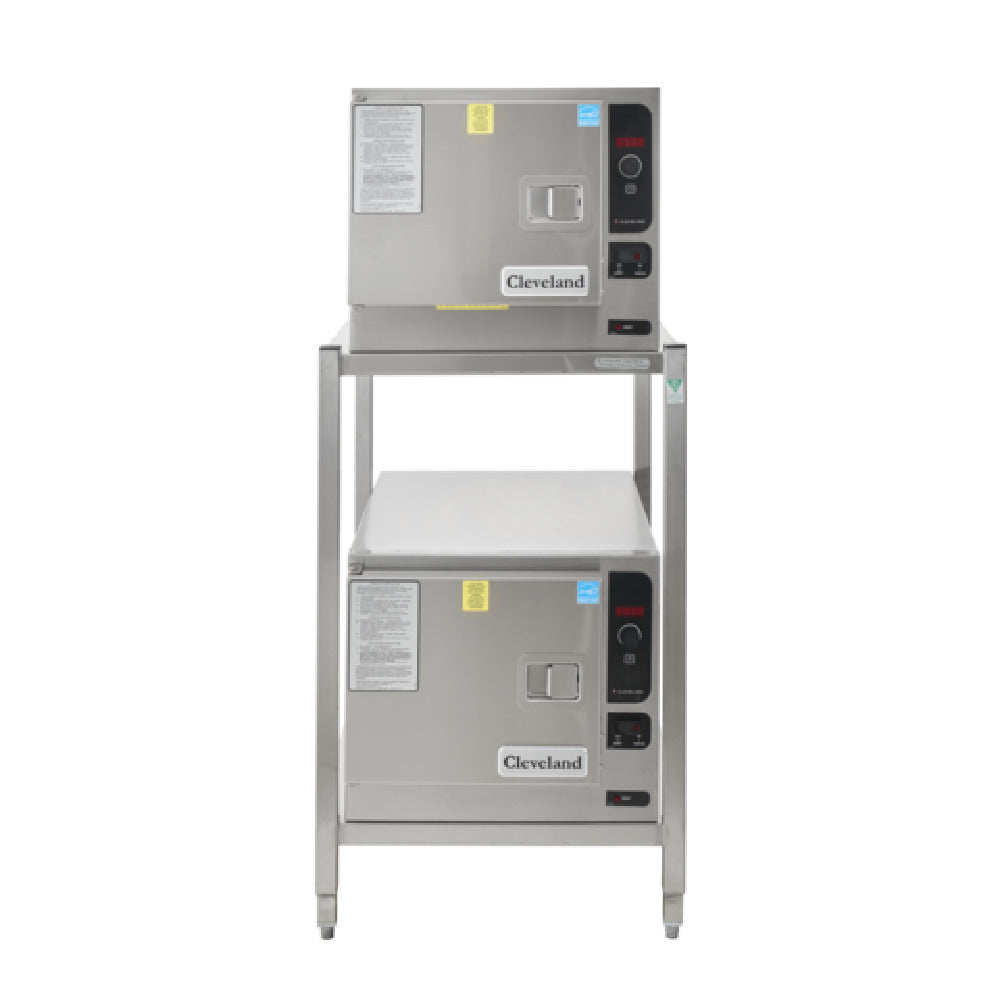 The Cleveland (2) 22CET33.1_208/60/3 SteamChef™ 3 Convection Steamers Electric Boilerless is an advanced cooking solution designed for commercial kitchens prioritizing efficiency and performance. This electric boilerless steamer features a direct stacked configuration, with two 22CET3.1 units mounted on the UNISTAND25 equipment stand, which includes the CHEFSTACKIT for optimal space utilization. Each compartment accommodates a full-size pan capacity of three, catering to high-volume cooking needs. The left-hand hinged doors and right-positioned controls enhance operational convenience. The SteamChef™ innovation incorporates SureCook controls, providing precision with a 60-minute electro-mechanical timer that adjusts to load requirements. The automatic drain control system and KleanShield™ interior underscore its commitment to hygiene and maintenance ease. Supported by adjustable 4-inch legs, this steamer ensures stability and adaptability in installation. Certified by UL and cUL, and recognized by ENERGY STAR®, the Cleveland 22CET33.1 model is a dependable choice that aligns with energy-efficient standards, making it an ideal fit for culinary institutions looking to optimize their cooking processes while adhering to sustainability practices.