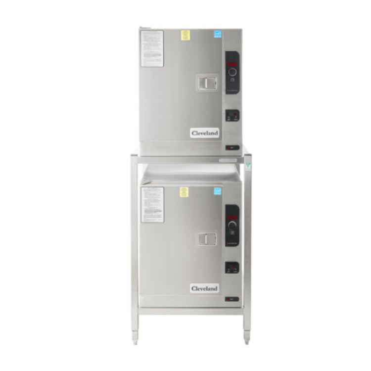 The Cleveland (2) 22CET66.1_208/60/1 SteamChef™ 6 Convection Steamer Electric Boilerless is an advanced culinary appliance tailored for professional kitchens requiring efficient, high-capacity steaming solutions. Featuring a double-stacked configuration on the ES26304066E equipment stand, it accommodates six full-size pans per compartment, maximizing productivity in busy environments. The unit operates on a 208-volt, 60 Hz, single-phase electrical connection, making it suitable for a variety of commercial settings. Its boilerless design ensures efficient water usage and reduces maintenance demands. The SteamChef™ 6 is equipped with SureCook controls for precise cooking and a 60-minute electro-mechanical timer alongside a manual continuous steaming bypass switch, allowing for flexible operation. The steamer also includes left-hand hinged doors with controls conveniently positioned on the right. Automatic drain and water level controls enhance safety and usability, while the KleanShield™ interior promotes hygiene. The exterior is constructed from stainless steel, providing durability and an aesthetic appeal. The unit is mounted on 4-inch adjustable legs with flanged feet for stability. It supports both standard treated and tap water connections. Certified by UL, cUL, and NSF, and recognized with an ENERGY STAR® rating, this steamer represents a reliable and energy-efficient choice for diverse culinary applications.