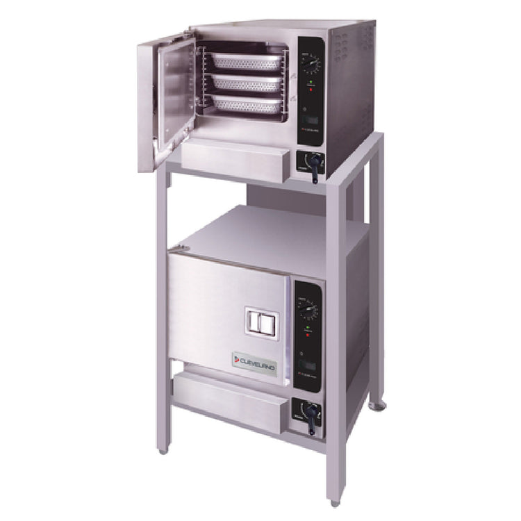 The Cleveland (2) 22CGT33.1_LP SteamChef™ 3 Convection Steamer, Gas, Boilerless, is an advanced kitchen appliance engineered for efficiency and versatility. This double-stacked convection steamer, mounted on the ES26304433G equipment stand, can accommodate three full-size pans per compartment, optimizing cooking capacity for high-demand environments. It features a 60-minute electro-mechanical timer and a manual bypass switch for continuous steaming, ensuring precision and flexibility in culinary operations. The steamer’s left-hand hinged doors and right-side controls offer ergonomic convenience. Automatic drain and water level controls enhance operational efficiency, reducing manual intervention. The KleanShield™ interior supports superior hygiene, making maintenance straightforward. This unit supports both treated and tap water connections, demonstrating adaptability in various kitchen settings. Constructed with a durable stainless steel exterior, it stands on 4-inch adjustable legs with flanged feet, providing stability and durability. Equipped with two 32,000 BTU outputs, the Cleveland SteamChef™ guarantees powerful performance while meeting energy efficiency standards, evidenced by its UL, NSF, and ENERGY STAR® certifications. This steamer is ideal for diverse segments within the food industry, from large-scale catering services to restaurant kitchens, offering exceptional functionality and reliability in a compact, boilerless design.