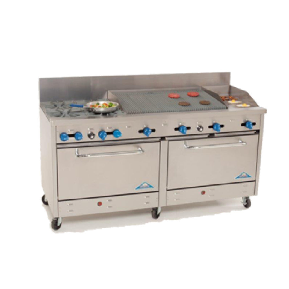 Comstock-Castle, 2F330-18-2.5RB, Range, gas, 72" wide, (4) Four star burners (Front burner 24,000 BTU) (Rear burner 30,000 BTU) with 12" square cast iron grates, (1) 18" - 3/4" thick griddle with manual controls, (1) 30" char-broiler, angle iron radiants, (2) extra wide 31" ovens with enamel bottom & door lining, (1) rack per oven, (3) rack positions, stainless steel exterior & 7" backguard, 6" stainless steel legs, welded frame, 2" clearance rating, 284,000 BTU, (2) 3/4" Gas Connection, NSF, cETLus