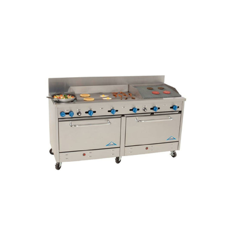 Comstock-Castle, 2F330-36-2RB, Range, gas, 72" wide, (2) Two star burners (Front burner 24,000 BTU) (Rear burner 30,000 BTU) with 12" square cast iron grates, (1) 36" - 3/4" thick griddle with manual controls, (1) 24" char-broiler, iron radiants, (2) extra wide 31" ovens with enamel linings, (1) rack per oven, (3) rack positions, stainless steel exterior & 7" backguard, 6" stainless steel legs, 246,000 BTU, 3/4" Gas Connection, NSF, ETL