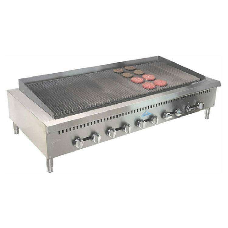 Comstock-Castle, CCHRB60, Char-Broiler, countertop, gas, 31" deep frame, 60" wide x 22" deep grill area, 13" to cook surface, (10) cast iron straight burners with heat reflector under-burner grease shield, each rated at 20,000 BTU, heavy cast iron radiants, cast iron top grates, stainless steel splash guards, insulated stainless steel frame finish, 4" stainless steel legs, (10) manual controls, 200,000 BTU total, cETLus, ETL-Sanitation