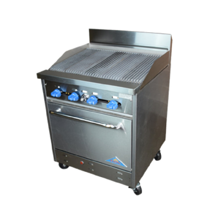 Comstock-Castle, F326-2.5RB, Range, gas, 30" wide, 26-1/2" wide standard oven with enamel door & bottom linings, (1) rack with 3 positions, (1) 30" char-broiler with iron radiants, stainless steel exterior, 8" back riser, 6" stainless steel legs, welded frame, 37" tall to cook surface, 110,000 BTU, NSF, ETL