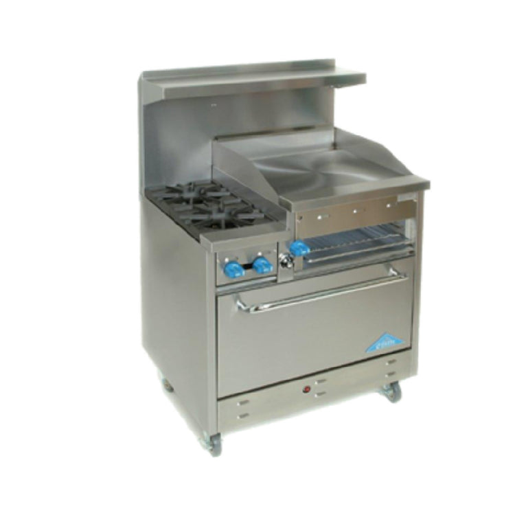 Comstock-Castle, F330-36B, Range, gas, 36" wide, (1) 36" x 3/4" thick raised griddle, with a stainless steel mesh flame spreader and a 30" x 18" warming rack below the griddle, (1) extra wide 31-1/2" wide oven with enamel linings and (1) oven rack, stainless steel exterior, back riser & high shelf, 6" stainless steel legs, 40" tall to cooking surface, 102,000 BTU, 3/4" gas connection, NSF, ETL