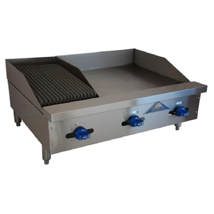 Comstock-Castle, FHP36-24-1RB, Char-Broiler/Griddle Combination, countertop, gas, 36" wide x 28" deep frame, (1) 12" x 21" char-broiler area, cast iron grates, sloped or flat, iron radiant, (1) 24" x 21" x 3/4" thick griddle plate, stainless steel splash guards on 3 sides, insulated stainless steel sides, 5" stainless steel legs, (3) manual controls, 83,000 BTU, 3/4" gas connection, NSF, ETL