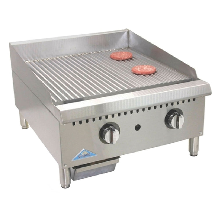 Comstock-Castle, HG24T-1-FG, Griddle, countertop, gas, 24" wide x 30" deep frame, 24" x 22.5" x 1" thick, fully grooved highly polished steel griddle plate, (2) thermostat controls, 4" splash guard on back & ends, 3" wide front grease trough, removable grease drawer, stainless steel exterior, 4" stainless steel legs, 60,000 BTU, NSF, cETLus, ETL-Sanitation