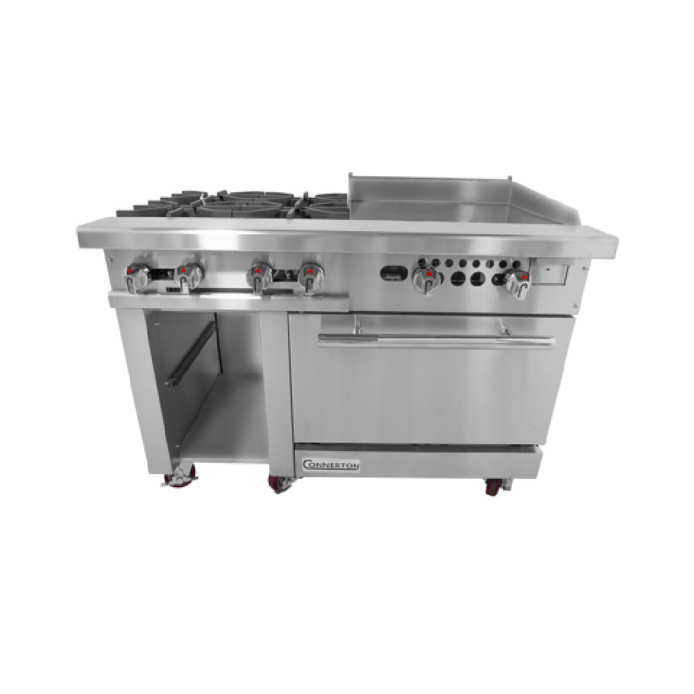 Connerton, CN48-4-24G_LP, Restaurant Range, gas, 48"W x 33.9"D, (4) 32,000 BTU open top burners, cast iron grates, 24" griddle 18,000BTU/hr, 1" thick polished steel, flash tube pilot, Bake-n-Roast oven @ 35,000 BTU, (1) oven rack with 3-positions, crumb tray, stainless steel front, sides, riser, lift-off high shelf & 6" adjustable legs, NSF, CSA STAR