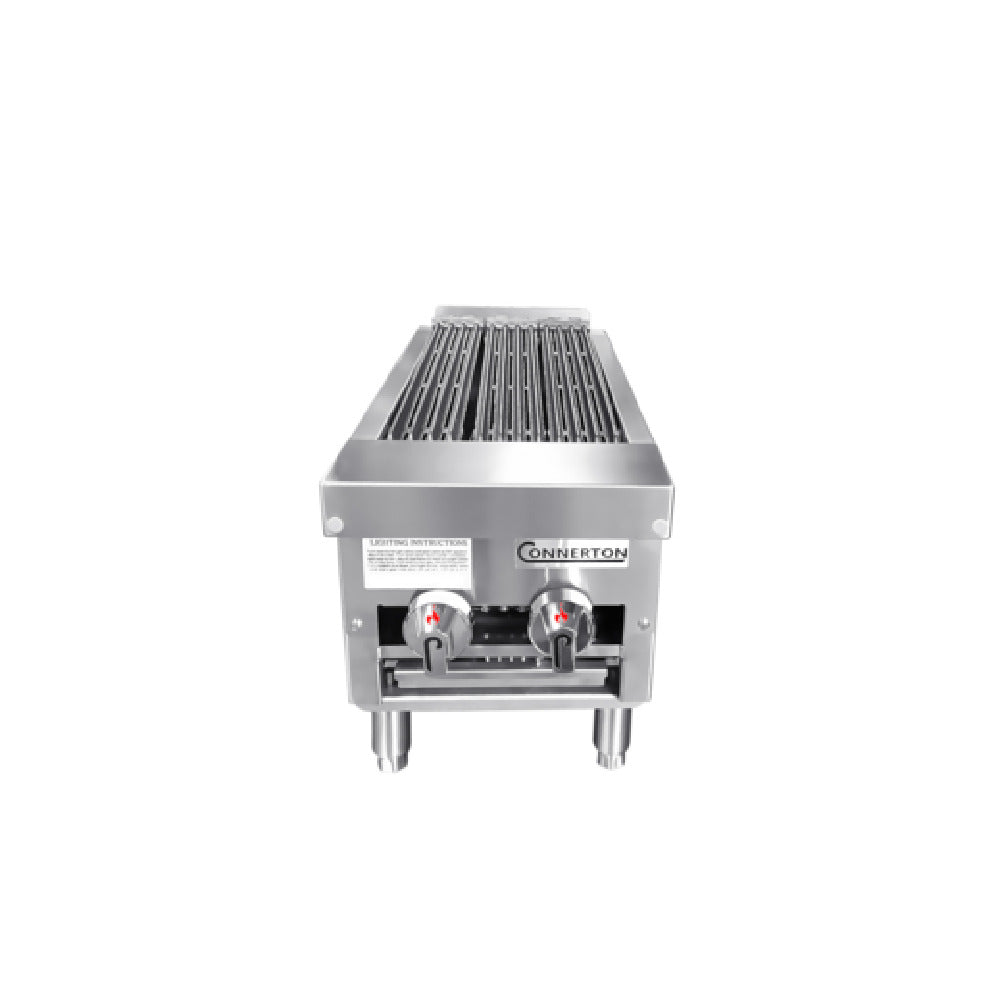 Connerton, CRB-12_LP, Charbroiler, countertop, gas, 12"W x 29"D, cast iron radiants & top grates with grease flow channels, manual controls, 3/4" NPT rear gas connection, fully welded stainless steel body, fire box, front panel & drip pan, (2) burners, 50,000 BTU, NSF, CSA