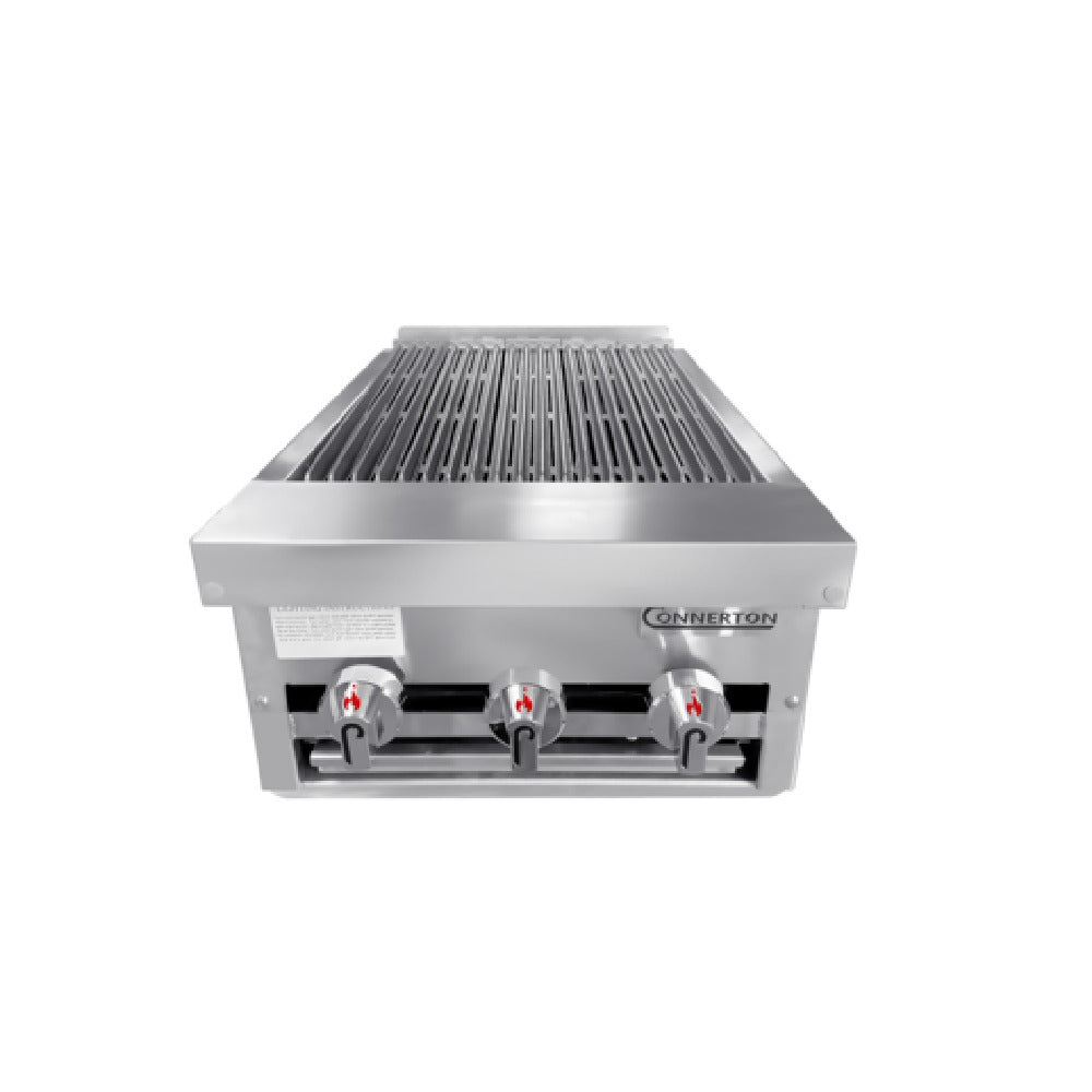 Connerton, CRB-18_LP, Charbroiler, countertop, gas, 18"W x 29"D, cast iron radiants & top grates with grease flow channels, manual controls, 3/4" NPT rear gas connection, fully welded stainless steel body, fire box, front panel & drip pan, 3 Burners, 75,000 BTU, NSF, CSA