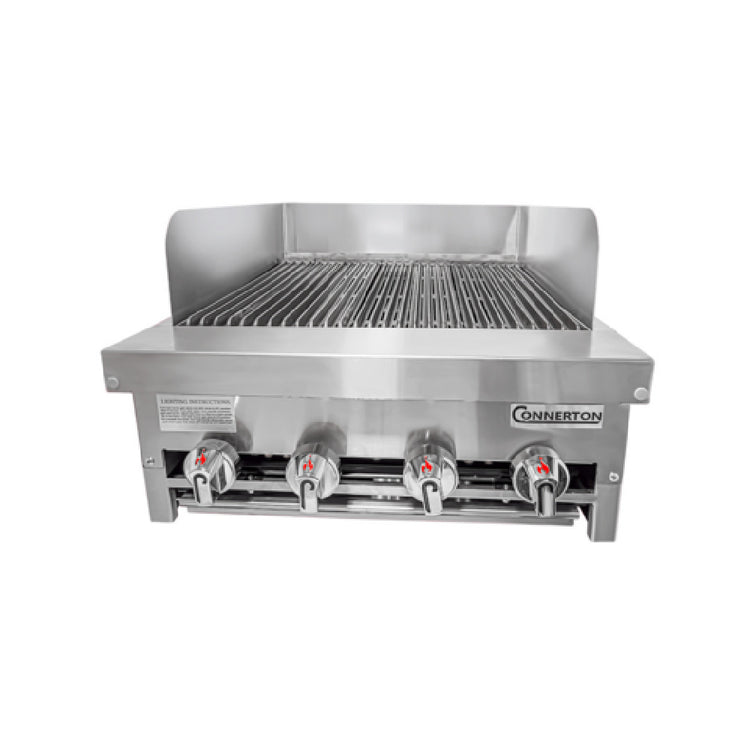 Connerton, CRB-30_NAT, Charbroiler, countertop, gas, 30"W x 29"D, cast iron radiants & top grates with grease flow channels, manual controls, 3/4" NPT rear gas connection, fully welded stainless steel body, fire box, front panel & drip pan, 5 Burners, 125,000 BTU, NSF, CSA