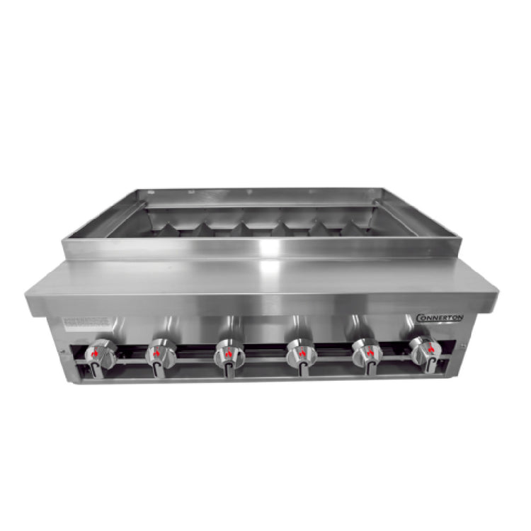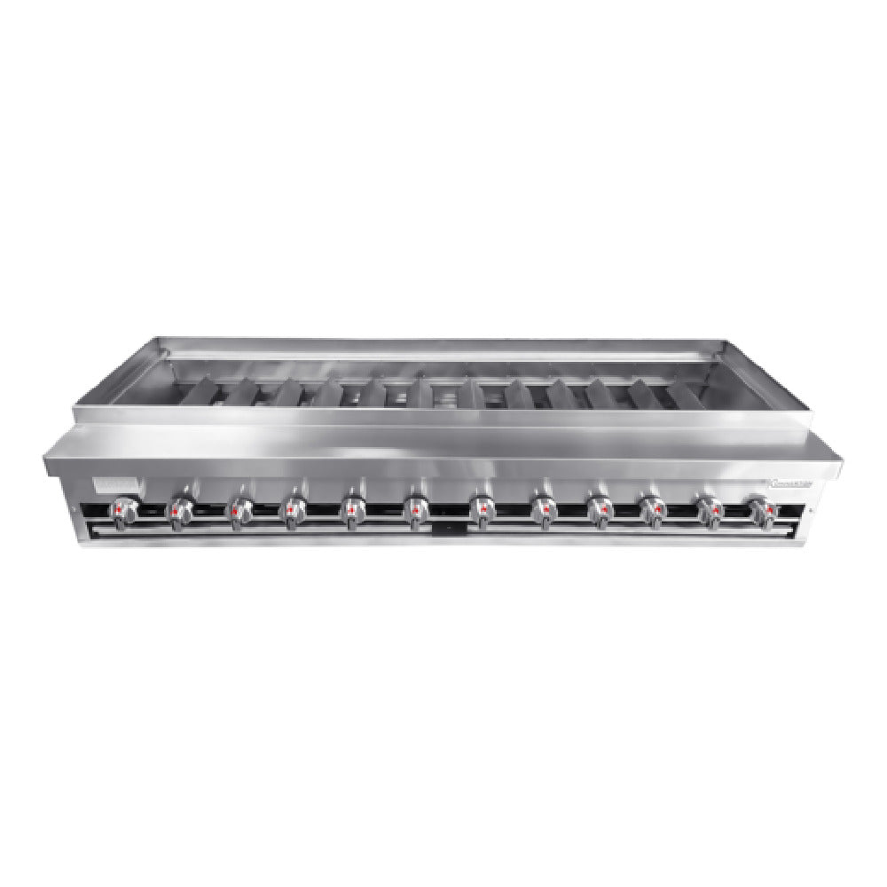 Connerton, KABOB-72_LP, Kabob Broiler, gas, 72"W x 28"D, controlled stainless steel straight burners, spaced every 6”, (12) burners, angled radiants control flare-up, removable crumb tray, 4” stainless Steel adjustable legs, 25,000 BTUs each burner