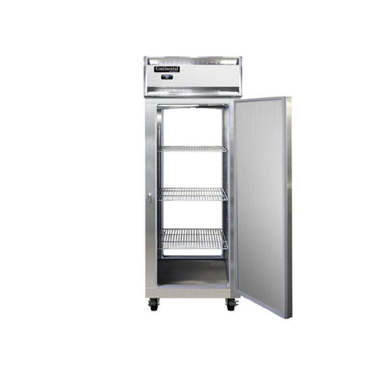 The Continental Refrigerator 1FENSAPT Extra-Wide Freezer Pass-thru 28-1/2"W is a highly efficient and versatile refrigeration unit designed for use in various commercial settings. This one-section freezer features self-contained refrigeration, ensuring easy installation and maintenance. Its stainless steel exterior and aluminum interior guarantee durability and resistance to corrosion, making it suitable for demanding environments. The freezer measures 28-1/2 inches wide, offering ample storage space within a standard depth design. It comes equipped with full-height solid doors and cylinder locks, providing security and energy efficiency. The electronic control with digital display allows for precise temperature management, while the hi-low alarm ensures safety by alerting users to temperature fluctuations. The electric condensate evaporator enhances the unit's efficiency by managing condensate, while the R290 hydrocarbon refrigerant aligns with modern environmental standards. Powered by a 1/2 HP motor, the 1FENSAPT meets cETLus and NSF standards, emphasizing its quality and reliability. This freezer is ideal for industries requiring consistent and reliable freezing capabilities, such as restaurants, hotels, and catering services, where maintaining food quality and safety is paramount. Its pass-thru design facilitates easy access from both sides, streamlining operations in busy kitchens and food service environments.