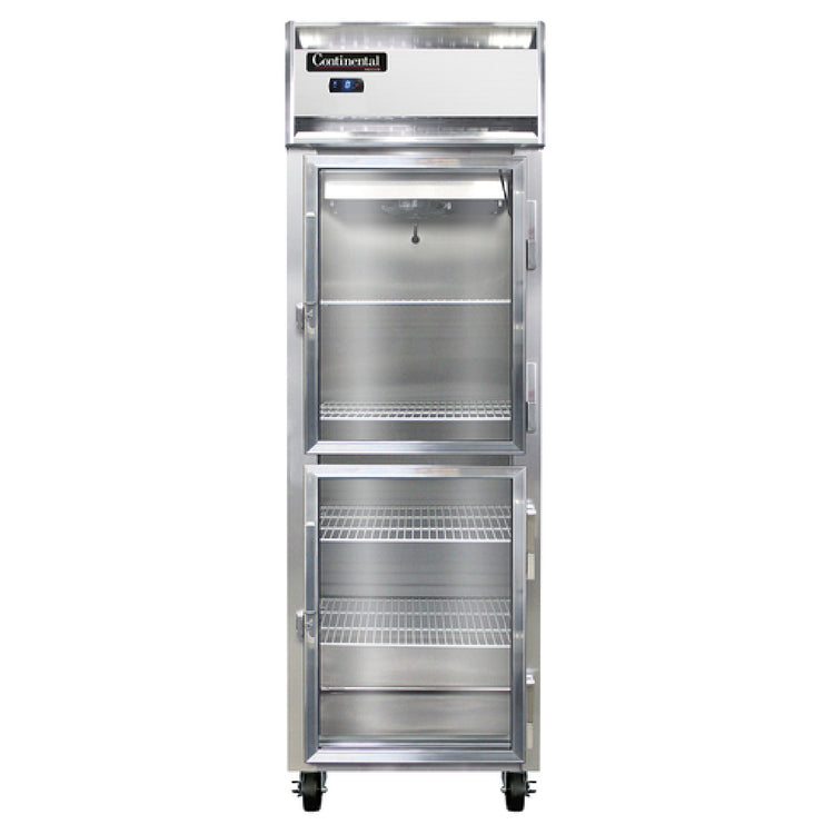 The Continental Refrigerator 1FSNGDHD Freezer Display One-section is a sophisticated refrigeration unit designed for optimal performance in diverse market segments within the commercial refrigeration industry. This freezer features a self-contained refrigeration system with a sturdy aluminum exterior and interior and a stainless steel front, ensuring durability and a sleek appearance. With a shallow depth, it is ideal for space-constrained environments. The hinged half-height glass doors provide easy access while maintaining visibility, secured with reliable cylinder locks. Equipped with an advanced electronic control system and a digital display, the unit offers precision in temperature management, capable of operating as low as -10°F. This feature is crucial for environments requiring strict temperature regulation. Additionally, the hi-low alarm system enhances operational safety by alerting users to any temperature deviations. The freezer utilizes R290 Hydrocarbon refrigerant, a more environmentally friendly option with a 1/2 HP compressor, ensuring energy efficiency and robust performance. Its compliance with cETLus and NSF standards underscores its quality and safety in food storage applications. The Continental Refrigerator 1FSNGDHD is an ideal choice for restaurants, cafes, and any food service establishment looking for a reliable, efficient, and environmentally conscious refrigeration solution.