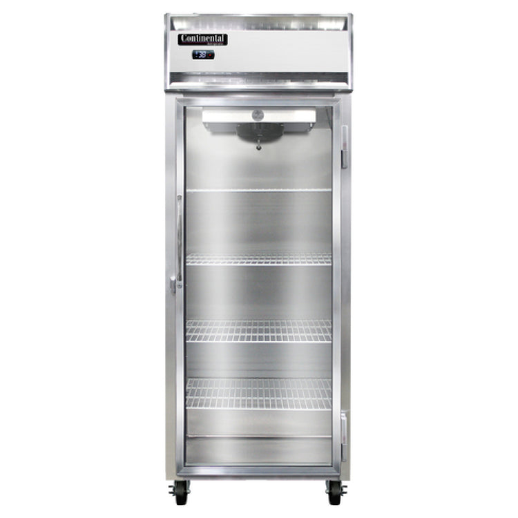 The Continental Refrigerator 1RENSSGD Extra-Wide Refrigerator Reach-in 28-1/2"W is a high-performance refrigeration unit designed for diverse industrial applications. This refrigerator boasts an extra-wide 28-1/2-inch width, providing ample storage space within its one-section design. The unit features a robust stainless steel exterior and interior, ensuring durability and ease of maintenance. Its full-height glass door not only enhances visibility but also includes a cylinder lock for security. The self-contained refrigeration system employs an R290 Hydrocarbon refrigerant, aligning with environmentally conscious practices. Operating with a 1/4 HP compressor, the refrigerator efficiently maintains optimal cooling conditions, aided by its electric condensate evaporator. The electronic control system, complete with a digital display and hi-low alarm, allows for precise temperature management. Certified by cETLus, NSF, and ENERGY STAR, the Continental Refrigerator 1RENSSGD meets stringent safety and energy efficiency standards, making it a reliable choice for commercial kitchens, laboratories, and other professional environments. This refrigerator is engineered to deliver superior performance and reliability, with its standard depth design fitting seamlessly into various settings while offering exceptional cold storage solutions.