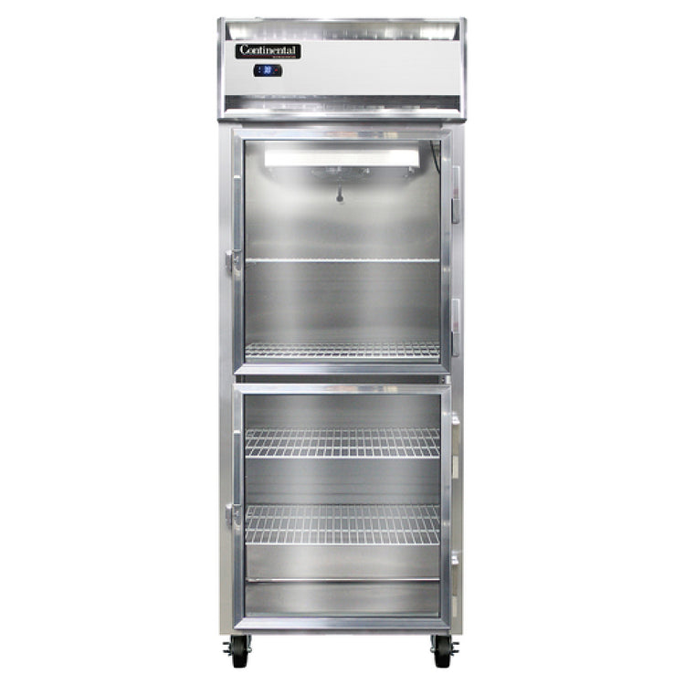 The Continental Refrigerator 1RESNSAGDHD Extra-Wide Refrigerator is a meticulously designed reach-in unit measuring 28-1/2 inches in width, making it a compact yet efficient solution for commercial refrigeration needs. This one-section refrigerator features self-contained refrigeration systems for ease of use and maintenance. Its robust construction includes a stainless steel exterior that ensures durability, coupled with an aluminum interior that facilitates efficient cooling. The shallow depth design allows for easy integration into various spaces while maintaining ample storage capacity. One of the standout features is the wide half-height glass doors, which provide clear visibility of stored items and are secured with cylinder locks for added safety. The electronic control with a digital display offers precise temperature management, complemented by a hi-low alarm system for consistent monitoring. Using R290 Hydrocarbon refrigerant, this refrigerator is an eco-friendly choice, adhering to modern environmental standards. With a 1/4 HP motor, the unit ensures reliable performance, and its certifications, including cETLus and NSF, validate its adherence to safety and quality standards. The Continental Refrigerator 1RESNSAGDHD is suitable for various market segments, including restaurants, cafes, and catering services, seeking a reliable and efficient refrigeration solution.