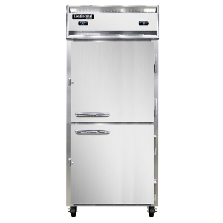 The Continental Refrigerator 1RFXNSSHD Extra-Wide Refrigerator/Freezer Reach-in 36-1/4"W is a versatile appliance, perfect for commercial kitchens seeking a dual-function refrigeration solution. This one-section, over/under unit features self-contained refrigeration and a stainless steel exterior and interior, ensuring durability and easy maintenance. With dimensions of 36-1/4 inches in width, it fits seamlessly into various kitchen layouts while offering ample storage space. The appliance is fitted with two half-height solid self-closing doors, equipped with cylinder locks for security. It incorporates an electronic control with a digital display, allowing precise temperature management. The freezer compartment can be adjusted to operate as low as -10°F, catering to specific storage needs. An integrated hi-low alarm ensures optimal temperature monitoring, while the LED interior lighting enhances visibility. Included are four epoxy-coated steel shelves, providing flexible storage options. The electric condensate evaporator and use of R290 Hydrocarbon refrigerant highlight its energy efficiency and environmental responsibility. With dual 1/5 and 1/3 HP motors, this unit is both powerful and efficient. Certified by cETLus and NSF, it meets rigorous safety and sanitation standards, making it a reliable choice for various segments within the food service industry.