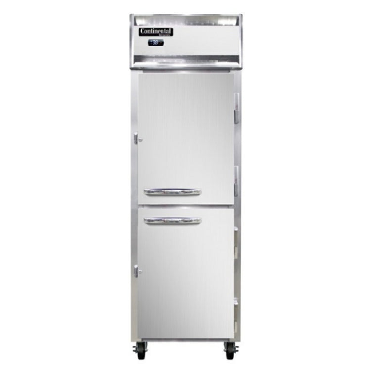 Continental Refrigerator, 1RNSAPTHD-SD-GD, Refrigerator, pass-thru, 21 cu. ft. capacity, one-section, self-contained refrigeration, standard depth, half-height solid doors on front, half height glass doors on rear, electronic controller with digital display, electric condensate evaporator, stainless steel exterior, aluminum interior, 5" casters, NEMA-5-15P, 1/4 HP, cETLus, NSF, Made in the USA