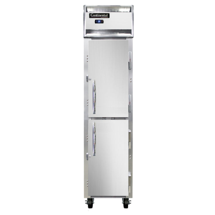 The Continental Refrigerator 1RSESNSAHD Slim Line Refrigerator Reach-in 17-3/4"W is a highly efficient appliance designed for commercial spaces where space optimization is crucial. This unit features a one-section, self-contained refrigeration system that is perfect for compact locations with its shallow depth. The aluminum interior and stainless steel exterior ensure durability and easy maintenance, ideal for the demanding environment of food service industries. Its half-height solid doors are fitted with cylinder locks, offering both security and energy efficiency. The electronic control with a digital display allows precise temperature management, while the hi-low alarm provides added assurance for maintaining optimal storage conditions. Utilizing the eco-friendly R290 Hydrocarbon refrigerant, this refrigerator supports sustainable practices. With a 1/4 HP motor, it delivers reliable cooling performance. The 17-3/4" width is particularly advantageous for establishments needing efficient storage solutions without compromising valuable floor space. Certified by cETLus and NSF, this refrigerator meets stringent safety and quality standards, making it a reliable choice for varied segments across the food service industry, from compact cafes to bustling restaurant kitchens. Its slim design and robust functionality are tailored to enhance operational efficiency while adhering to modern environmental and safety standards.