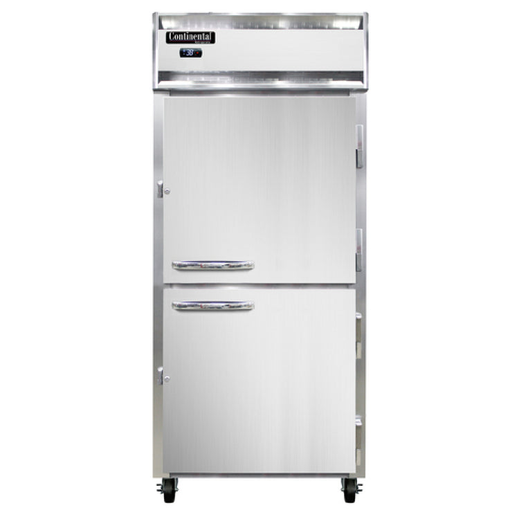 The Continental Refrigerator 1RXNHD Extra-Wide Refrigerator Reach-in 36-1/4"W is a robust cooling solution designed to meet the diverse requirements of various commercial segments. With a width of 36-1/4 inches, this one-section refrigerator is crafted for those requiring an extra-wide reach-in unit. The exterior features a sleek stainless steel front, while the interior and ends are made of durable aluminum, ensuring longevity and resistance to wear. It includes half-height solid doors equipped with cylinder locks for enhanced security. The self-contained refrigeration system utilizes R290 Hydrocarbon refrigerant, which is environmentally friendly. Furthermore, it boasts a 1/3 HP motor, ensuring efficient and consistent cooling performance. The electronic control system, complete with a digital display and hi-low alarm, provides precise temperature management. Additionally, the electric condensate evaporator contributes to effective moisture control. This refrigerator is cETLus and NSF certified, emphasizing its compliance with industry standards. Being ENERGY STAR® rated, it is designed for energy efficiency, which is crucial for reducing operational costs. The Continental Refrigerator 1RXNHD is an ideal choice for businesses seeking a reliable and efficient refrigeration solution with advanced features tailored to meet specific market needs.