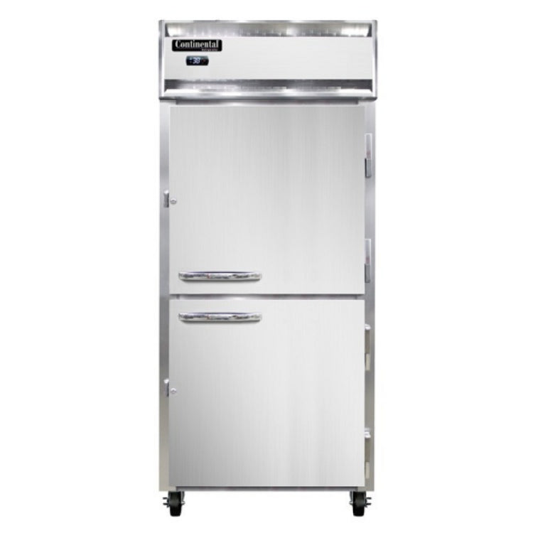 Continental Refrigerator, 1RXNSAPTHD-SD-GD, Extra-Wide Refrigerator, 30 cu. ft. capacity, pass-thru, 36-1/4" wide one-section, self-contained refrigeration, standard depth, half-height solid doors on front, half height glass doors on rear, electronic controller with digital display, electric condensate evaporator, stainless steel exterior, aluminum interior, 5" casters, NEMA-5-15P, 1/3 HP, cETLus, NSF, Made in the USA