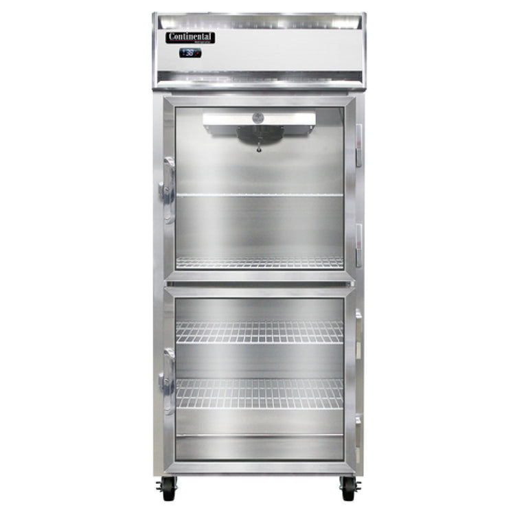The Continental Refrigerator 1RXNSSGDHD Extra-Wide Refrigerator Reach-in Display 36-1/4"W is a one-section refrigeration unit engineered for versatile use across various industry segments. With a stainless steel exterior and interior, it ensures durability and ease of maintenance. Its extra-wide design, measuring exactly 36-1/4 inches in width, is complemented by wide hinged glass half doors, providing a clear view of stored contents while offering easy access. Security is addressed through built-in cylinder locks. The refrigerator features self-contained refrigeration using environmentally-friendly R290 Hydrocarbon refrigerant. It operates with a 1/3 HP motor, ensuring efficient cooling. A digital electronic control system, complete with a digital display, facilitates precise temperature management. Additional technological features include a hi-low alarm for temperature monitoring and an electric condensate evaporator. Certified by cETLus and NSF, this unit adheres to stringent safety and sanitation standards. The Continental Refrigerator 1RXNSSGDHD is an ideal choice for businesses requiring reliable and spacious refrigeration solutions, catering to diverse needs in food service, hospitality, and retail environments.