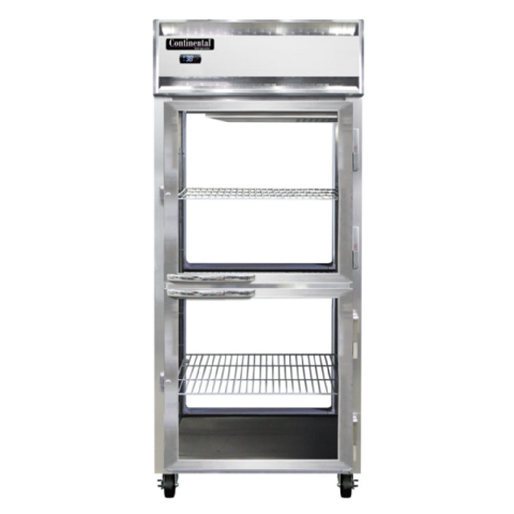 Continental Refrigerator, 1RXNSSPTHD-GD-GD, Extra-Wide Refrigerator, 30 cu. ft. capacity, pass-thru, 36-1/4" wide one-section, self-contained refrigeration, standard depth, half-height glass doors on front and rear, electronic controller with digital display, electric condensate evaporator, stainless steel exterior & interior, 5" casters, NEMA-5-15P, 1/3 HP, cETLus, NSF, Made in the USA