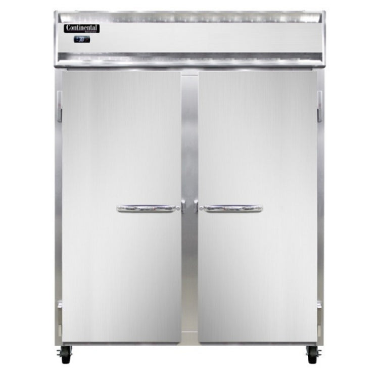 Continental Refrigerator, 2RENSAPT-SD-GD, Extra-Wide Refrigerator, 52 cu. ft. capacity, pass-thru, 57" wide two-section, self-contained refrigeration, standard depth, full-height solid doors on front, full-height glass doors on rear, electronic controller with digital display, electric condensate evaporator, stainless steel exterior, aluminum interior, 5" casters, NEMA-5-15P, 1/2 HP, cETLus, NSF, Made in the USA