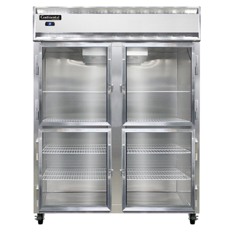 The Continental Refrigerator 2RESNGDHD Extra-Wide Refrigerator Reach-in 57"W is a versatile two-section unit designed for commercial kitchens and food service environments requiring efficient refrigeration solutions. With its self-contained refrigeration system, this model boasts a sturdy aluminum exterior and interior complemented by a sleek stainless steel front. The refrigerator is designed with a shallow depth for space optimization, making it suitable for varied kitchen layouts. Its wide half-height glass doors not only enhance visibility but also come equipped with cylinder locks for added security. The electronic control with digital display ensures precise temperature management, while the hi-low alarm provides alerts for temperature deviations, safeguarding stored products. Powered by R290 hydrocarbon refrigerant, this unit is both environmentally friendly and efficient, with a 1/3 HP compressor that meets the cETLus and NSF standards for safety and sanitation. The Continental Refrigerator 2RESNGDHD is an ideal choice for establishments that prioritize reliable performance, energy efficiency, and ample storage capacity within a 57-inch wide footprint, catering to diverse market segments ranging from restaurants and hotels to institutional kitchens.